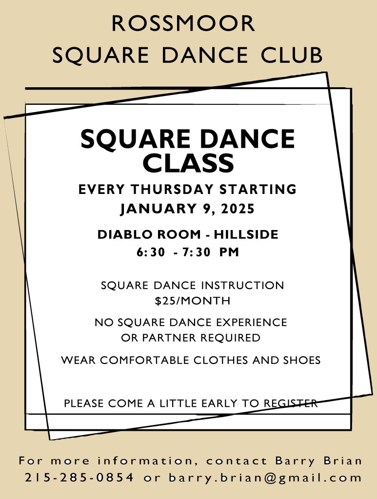 The Rossmoor Squares are in action now. Dancing from 6:30 pm to 9:00 pm. Alternating SSD class level and Mainstream club level. $5 guest fee.